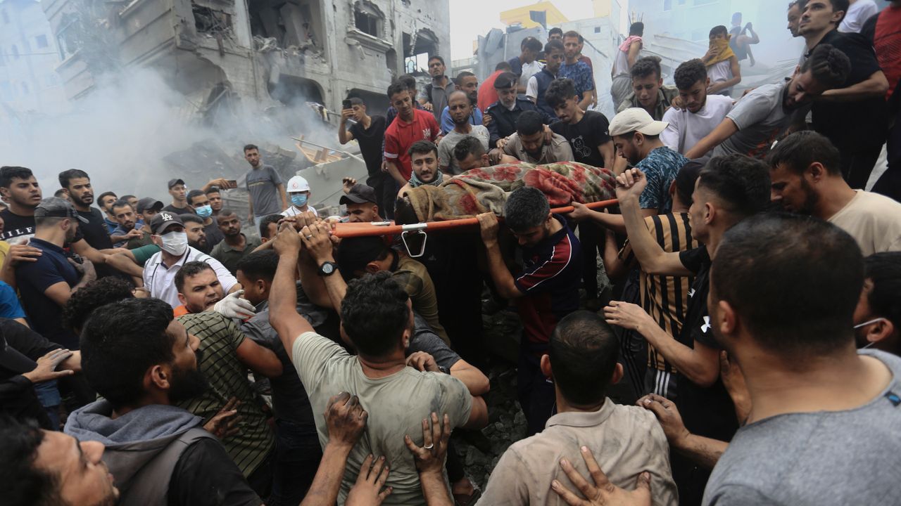 #Titelbild: Im Flüchtlingslager Rafah (Gazastreifen): Nach einem israelischen Bombenangriff tragen Palästinenser die Leichen von Getöteten aus den Trümmern, Montag, 9. Oktober 2023 [AP Photo/Rahmez Mahmoud]