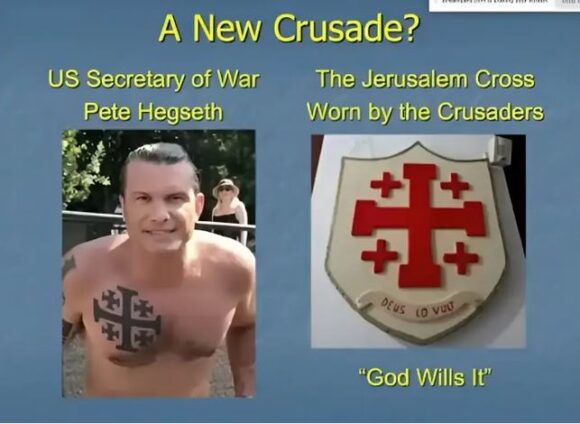 US-Kriegsminister Pete Hegseth, Zionist und religiöser Fanatiker, der sich als Kreuzritter sieht, schwört die US-Soldaten auf einen apokalyptischen Endkampf gegen das Böse ein.